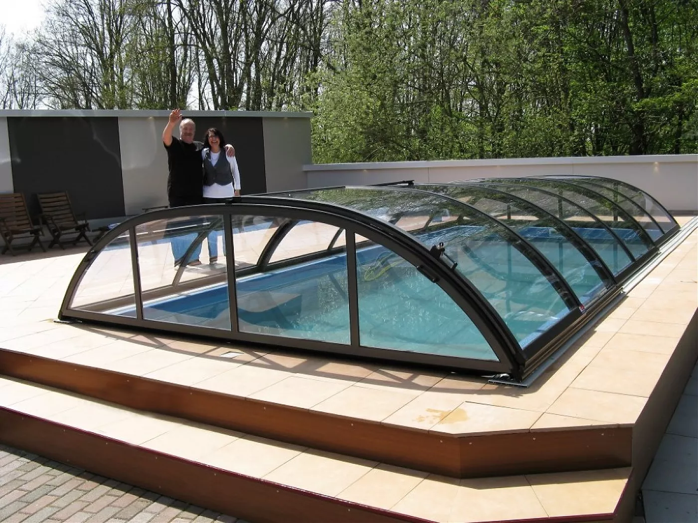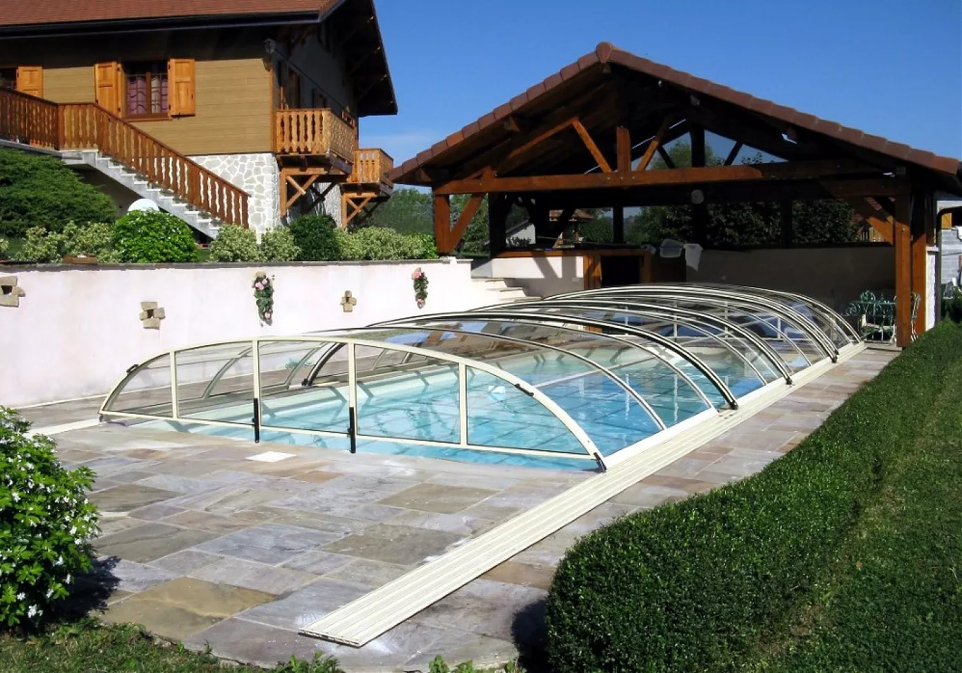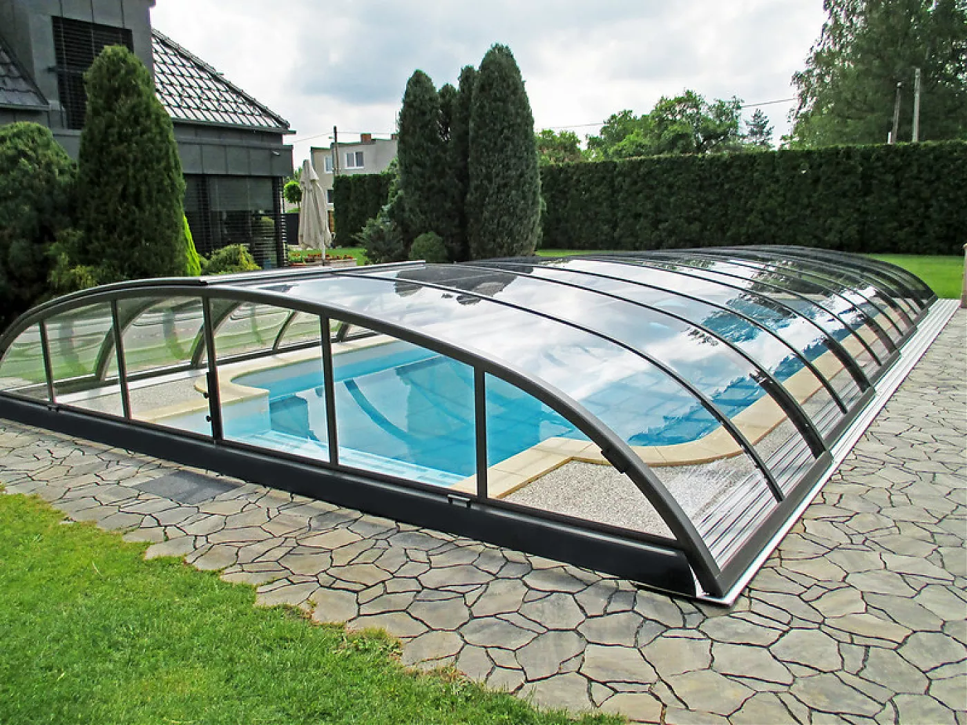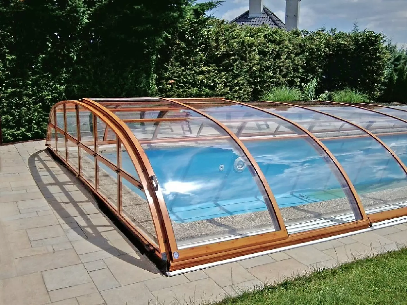 Павильон Elegant из подвижных дугообразных сегментов, комбинированных с вертикальной продольной стеной, позволит использовать внутреннее пространство помещения с трех сторон бассейна.