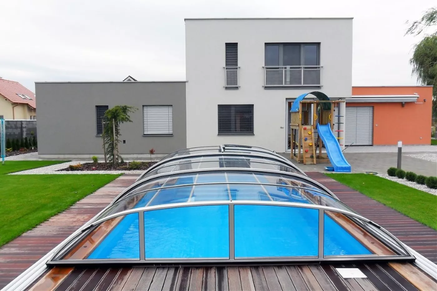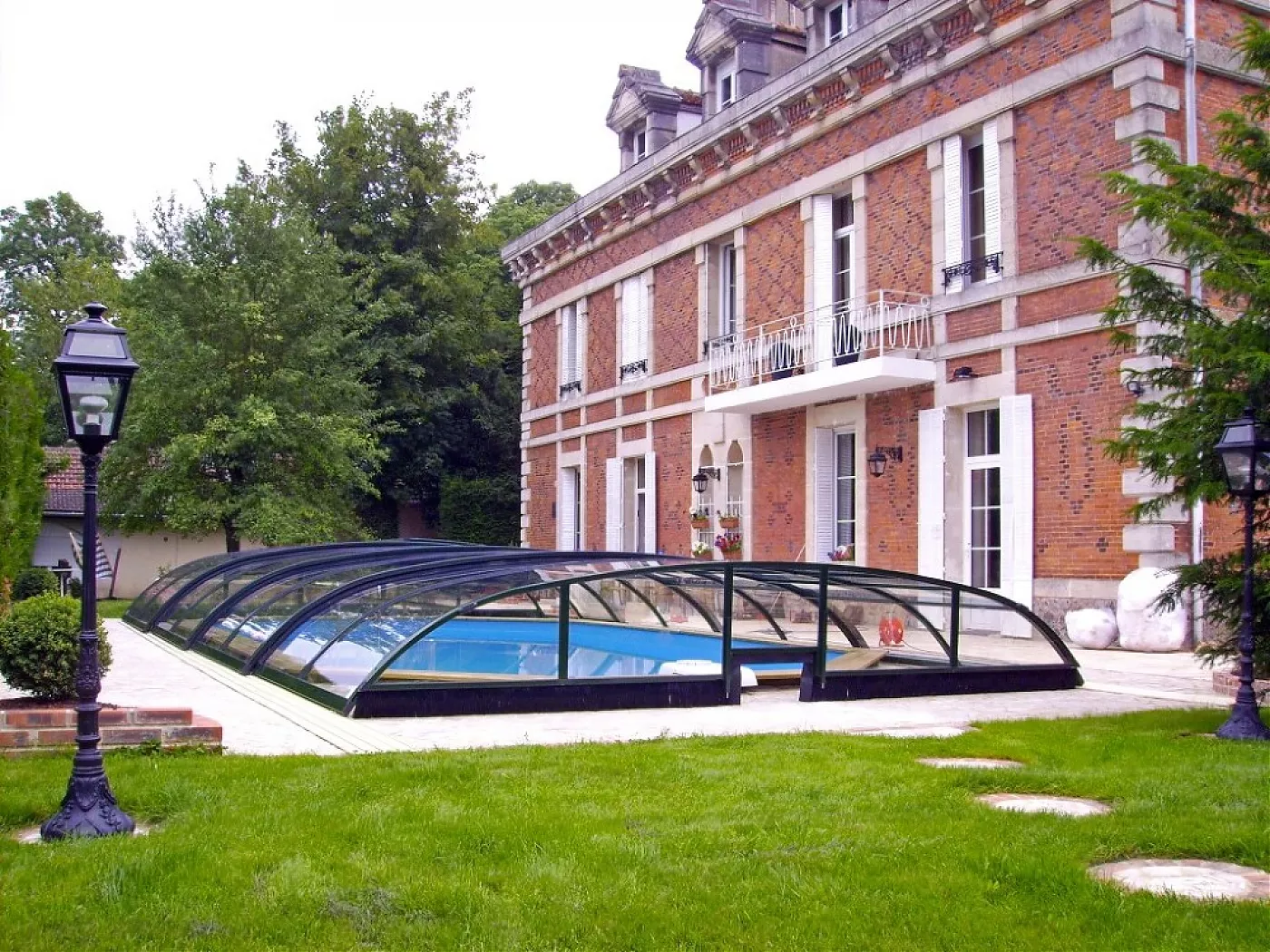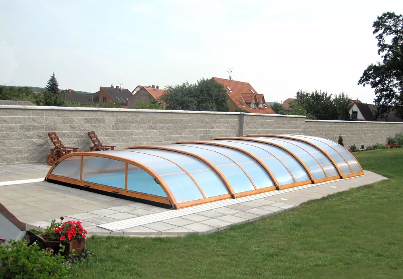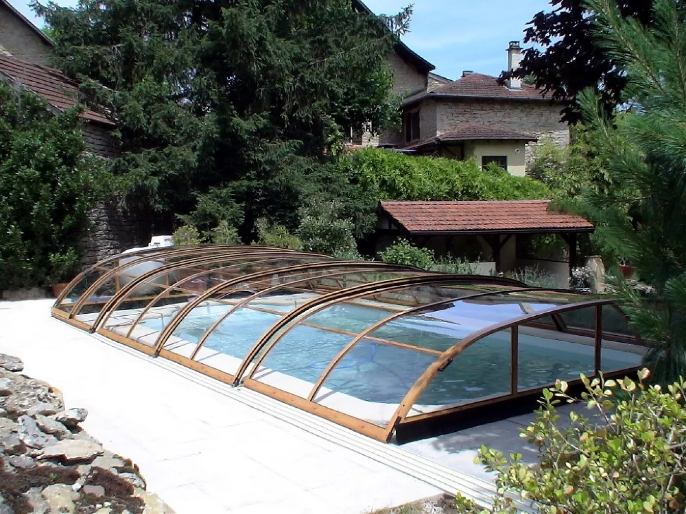 Павильон Elegant из подвижных дугообразных сегментов, комбинированных с вертикальной продольной стеной, позволит использовать внутреннее пространство помещения с трех сторон бассейна.