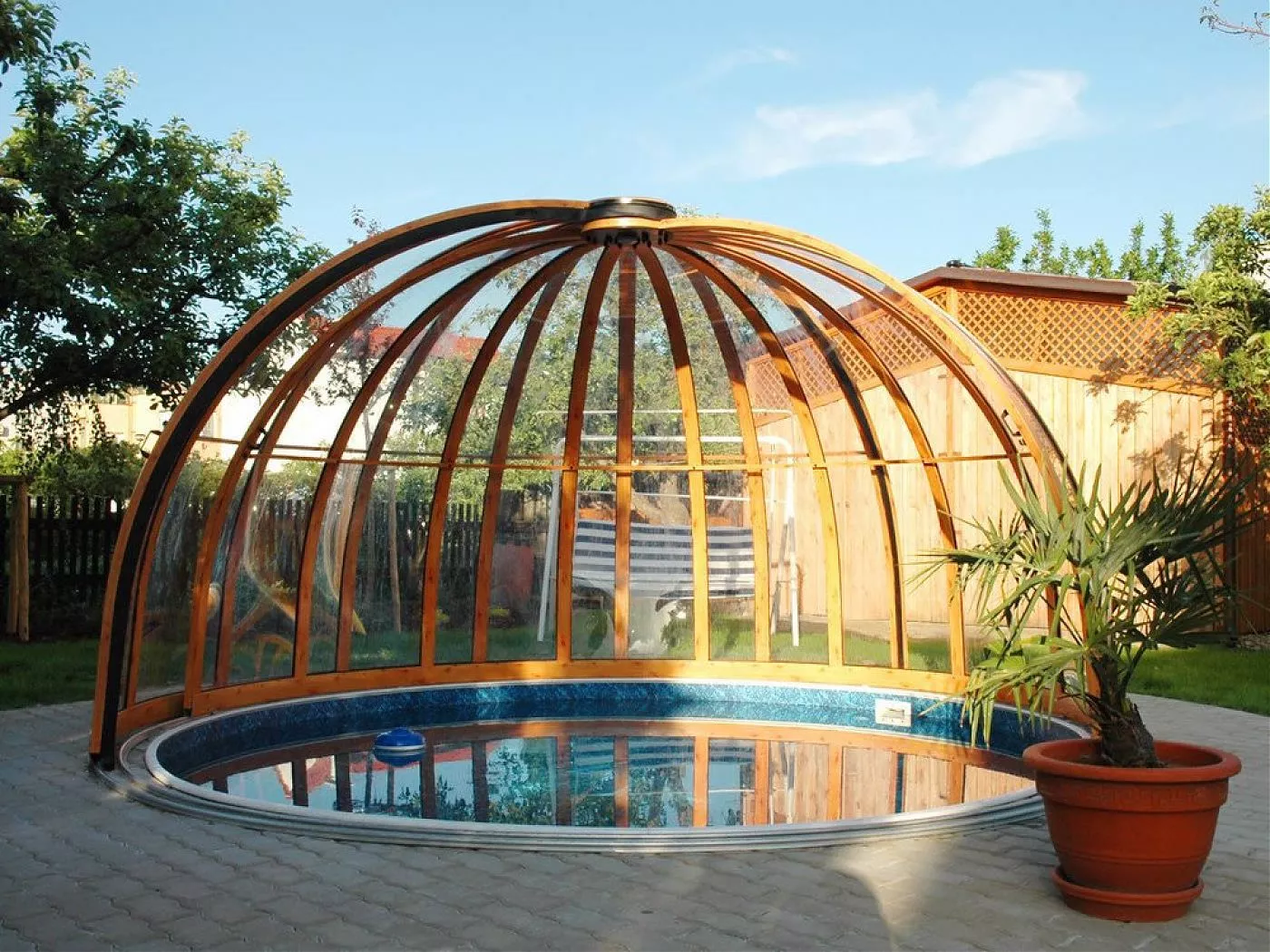 Павильон Orient выполнен в форме купола, что обеспечивает максимальное проникновение солнечного света в течение всего дня. Такая архитектура способствует естественному подогреву воды и воздуха внутри павильона, создавая комфортные условия для купания даже в прохладные дни. Кроме того, куполообразная форма обеспечивает достаточную высоту по всему периметру бассейна, не ограничивая внутреннее пространство и позволяя свободно перемещаться внутри павильона.